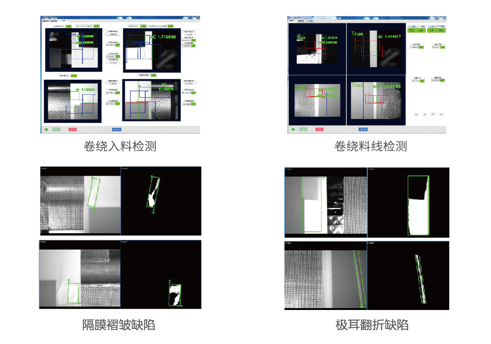 卷繞機是鋰電池成型的主要設備,通過驅(qū)動卷針將正負極片和隔膜按照特定的次序卷繞從而形成電芯,在此過程中,需使用視覺進行對齊度糾偏,同時識別相機視野范圍內(nèi)的涂布、隔膜缺陷,以保證產(chǎn)品質(zhì)量。我司采用KINOVISION視覺檢測平臺對卷繞過程中的陰陽極距離和整體電芯的尺寸進行檢測,同時創(chuàng)新采用深度學習相關(guān)算法,實時檢測涂布和隔膜的各類缺陷,提升產(chǎn)品質(zhì)量,該方案已批量應用于鋰電客戶。
