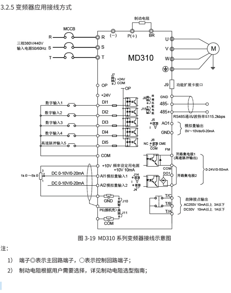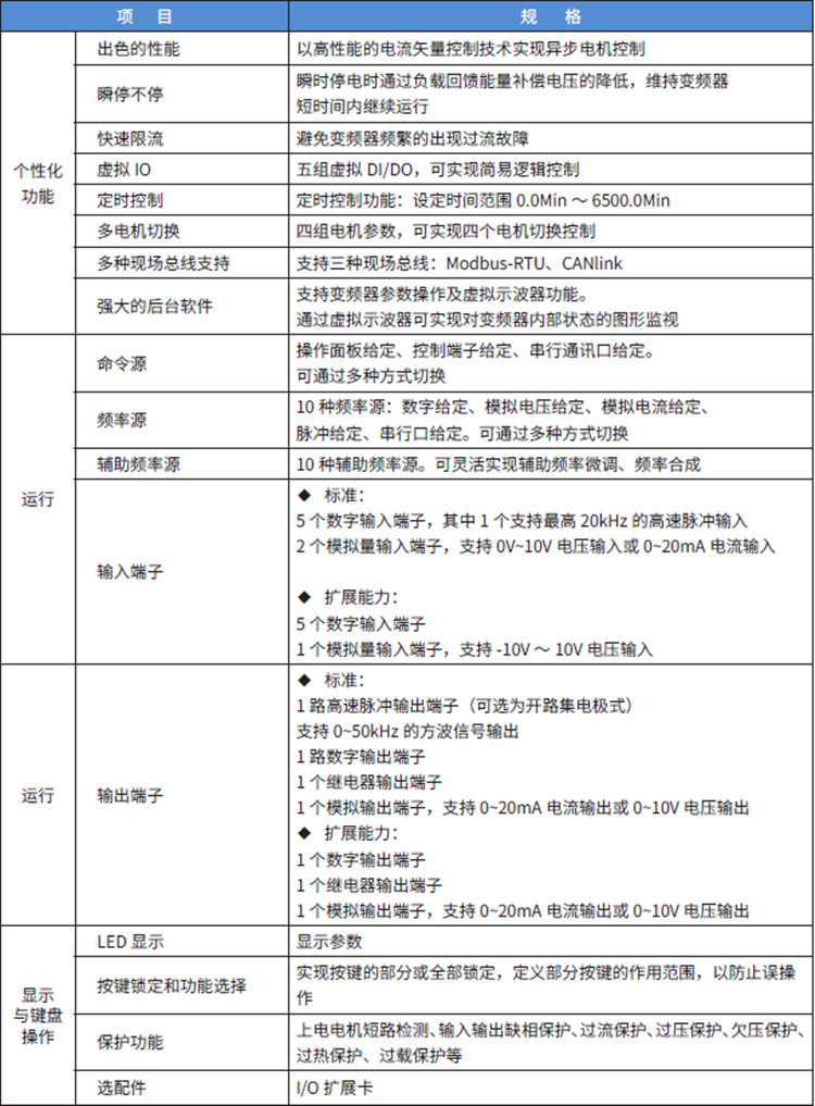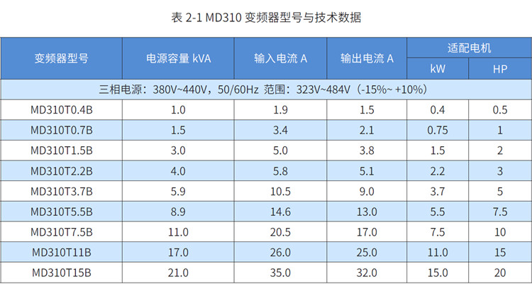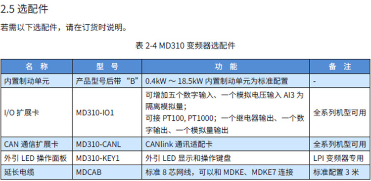 MD310 系列變頻器是一款通用緊縮型多功能變頻器,采用開環矢量和V/F 控制方式,以高性能的電流矢量控制技術可實現異步電機控制。MD310 標配RS485 通訊接口,支持Modbus RTU 通訊,可擴展I/O 擴展卡、CAN 通信擴展卡。內置PID 可方便實現閉環過程控制系統,最多可實現16 段速運行。
